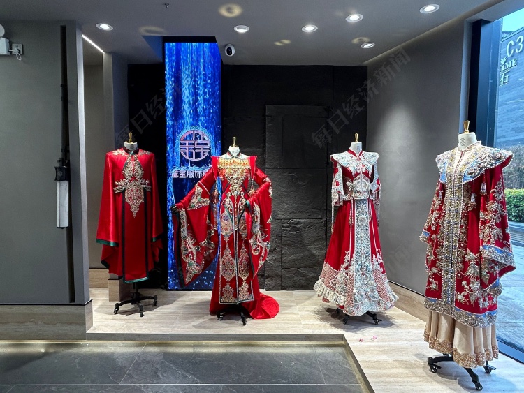 前幾年,虎丘婚紗城內(nèi)售賣的大部分是西式婚紗,但隨著中國傳統(tǒng)文化日益受到年輕人的喜愛,這幾年,中式婚禮也越來越流行。婚紗城中,中式秀禾店鋪也越來越多。