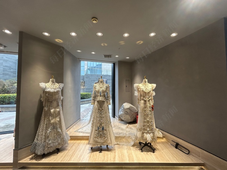 轉(zhuǎn)型前,金寶集團(tuán)的外貿(mào)訂單占比過半,轉(zhuǎn)行做新中式后,外貿(mào)訂單占比僅在3%—4%。不過,轉(zhuǎn)型成效顯著:目前,青睞中式秀禾的消費(fèi)者越來越多,不少高端禮服館主動(dòng)找上門尋求合作。