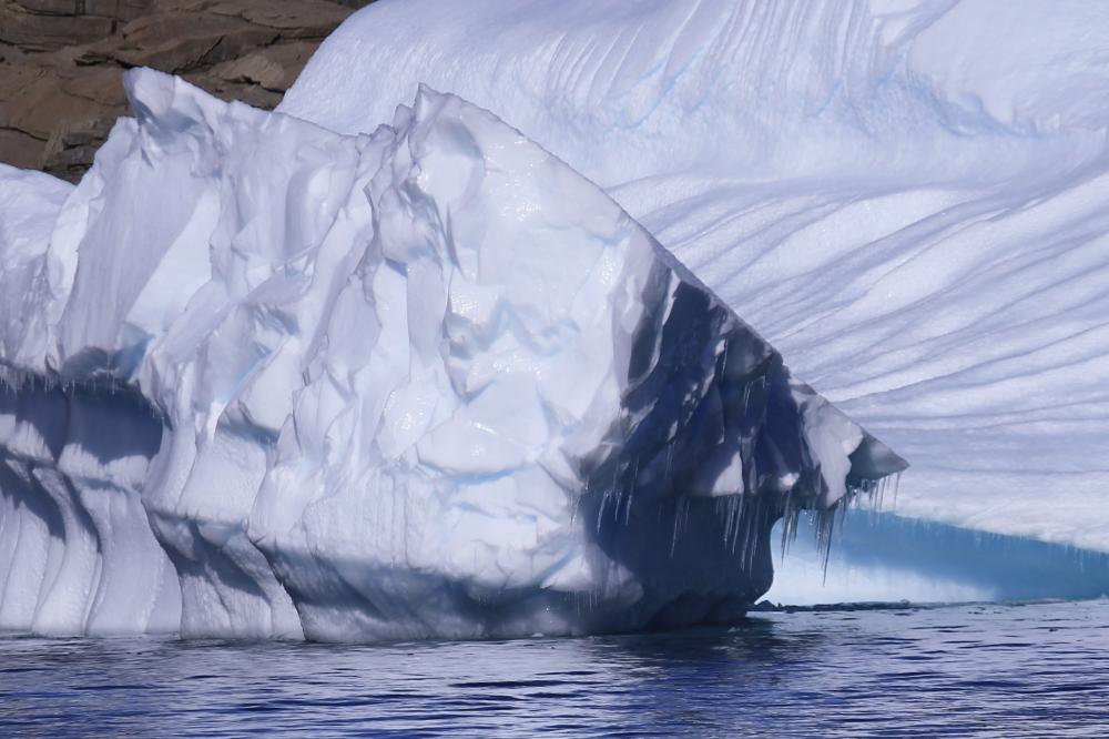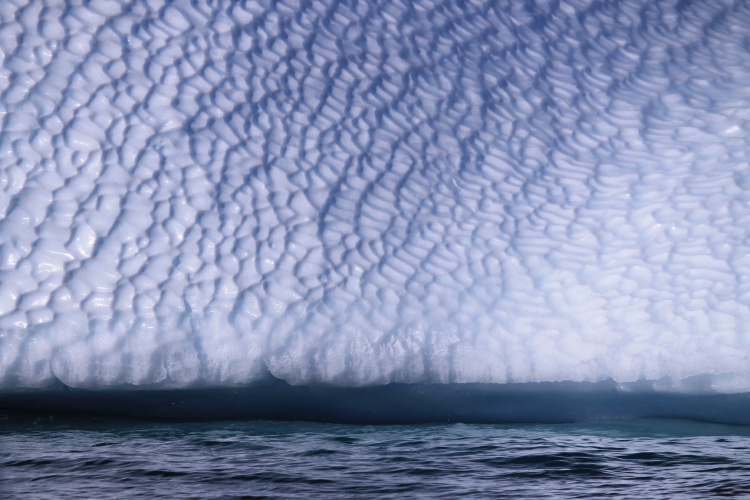 在社交媒體上,肥鵝分享了一組攝影作品,名為“冰川的肌理”。漫長的時光里,碎塊于冰山脫落,落在海洋中。經過風吹日曬,以及海浪的剝蝕,便雕琢出不同走向的紋路。“我們會坐著皮劃艇,在冰川之間穿梭,距離可能只有一米。肉眼看非常壯觀,那一刻會讓人非常敬畏自然。”