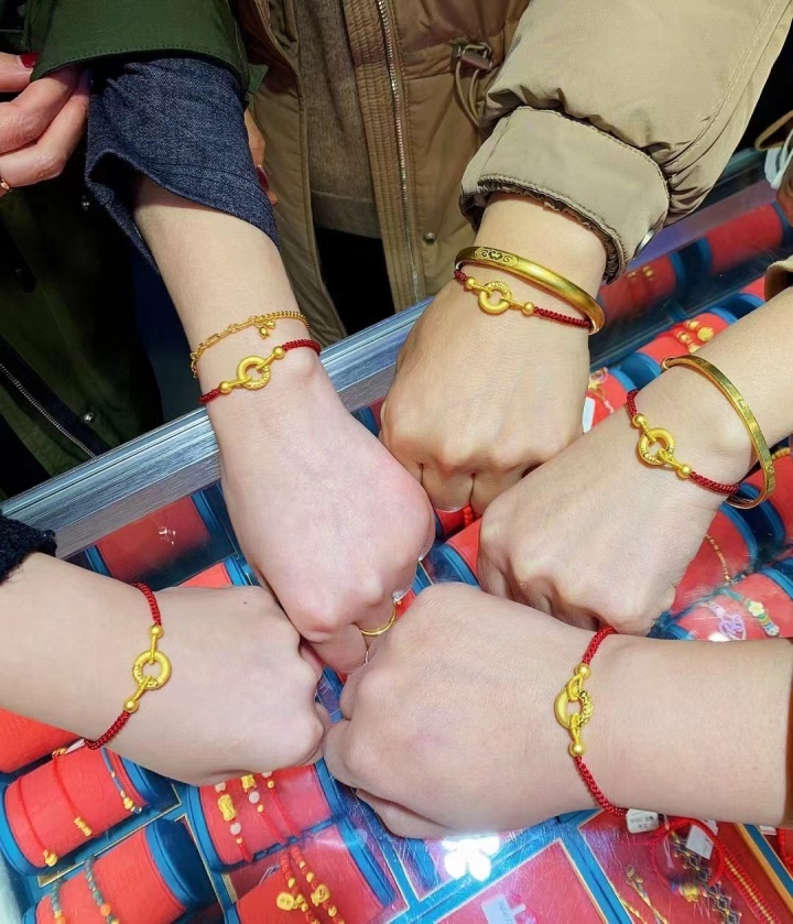 上海青浦一家金店店員介紹,“一般男士愛選平安無事牌,女士通常會選富富有余的最新款產(chǎn)品,上面結(jié)合了龍和魚的元素,寓意較好,整體門店的銷量和客流量較上月有明顯增長。”