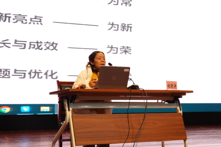 重慶文德中學(xué)校英語名師工作室主持人趙曉濤圍繞“生”“常”“新”“榮”四個關(guān)鍵字,從共同研讀課標(biāo)和專業(yè)書籍文獻(xiàn)、提高課堂效率、落實常規(guī)課科研等方面分享了工作室的日常。